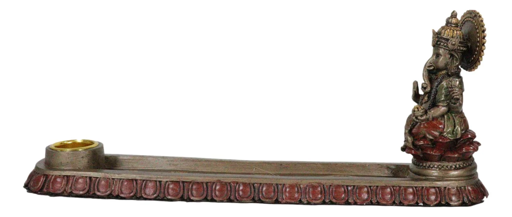 • This Hindu Ganesha Incense Burner Statue stands at 4" Tall, 10.5" Wide and 2.25" deep approximately. It weighs about 10 ounces.