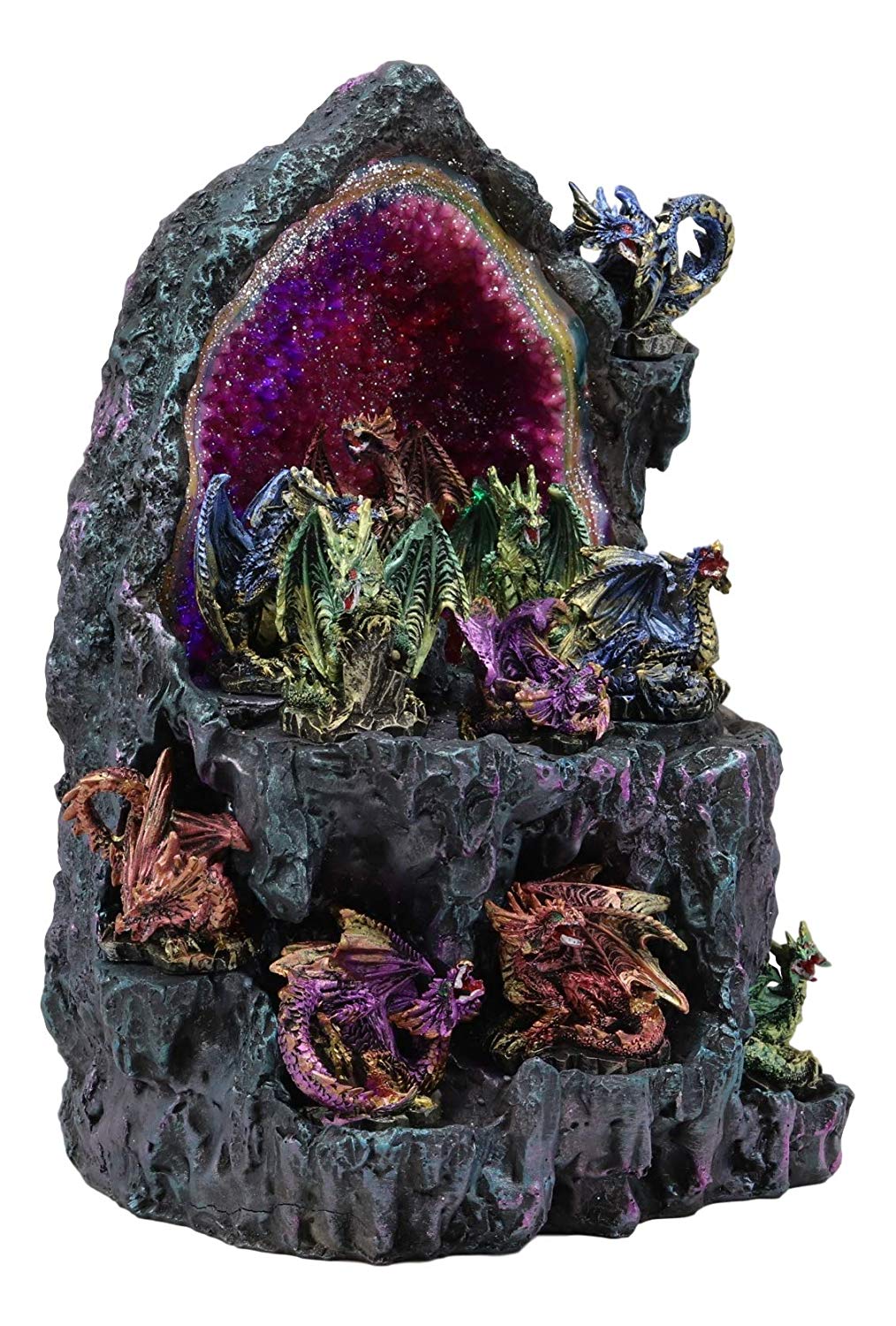 • This exotic display stand takes you back to the medieval renaissance dragons and dungeons era in legendary times. This is the Dragon's Lair, full of mythical powers and magic. The Faux Crystal Geode Cave Rock, lights up with colorful LEDs to provide a subtle night light or courtesy light when needed.