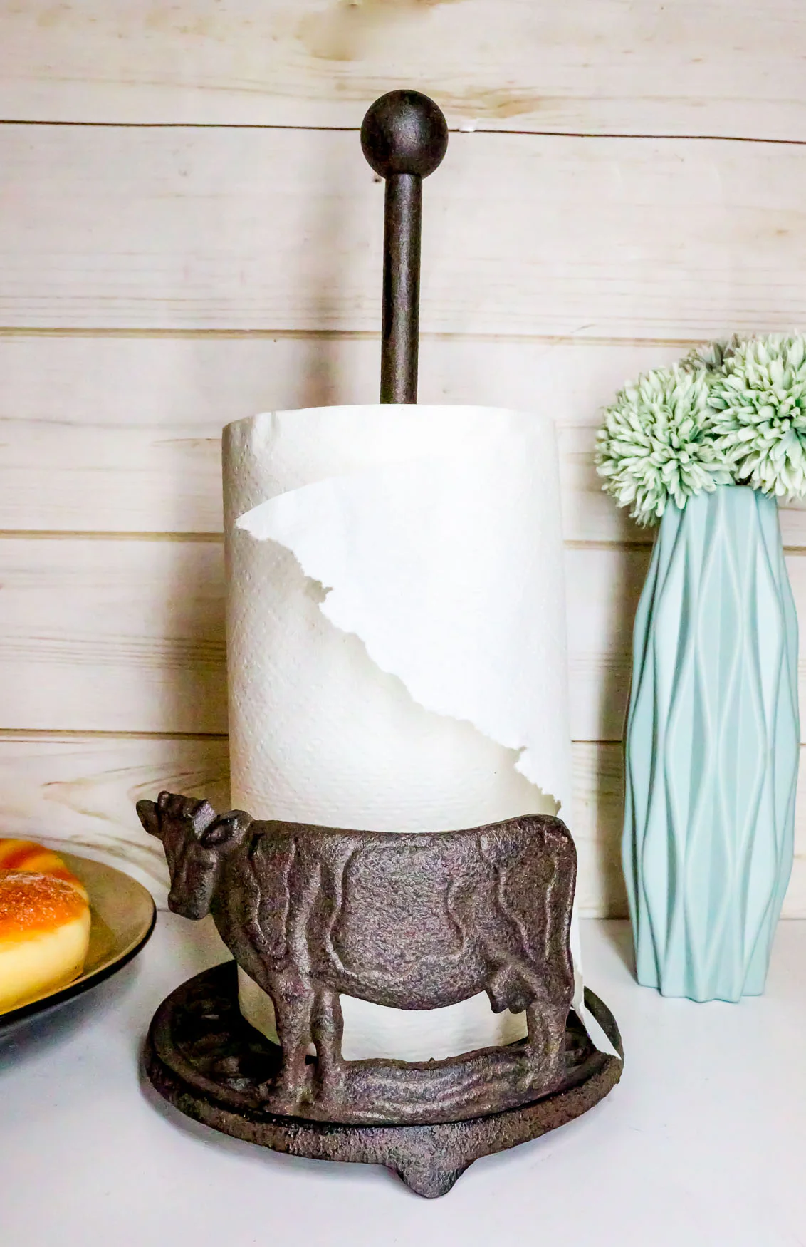 • This Bovine Cow With Scroll Art Design Paper Towel Holder is made of high quality cast iron metal, hand painted and polished individually in rustic finish.