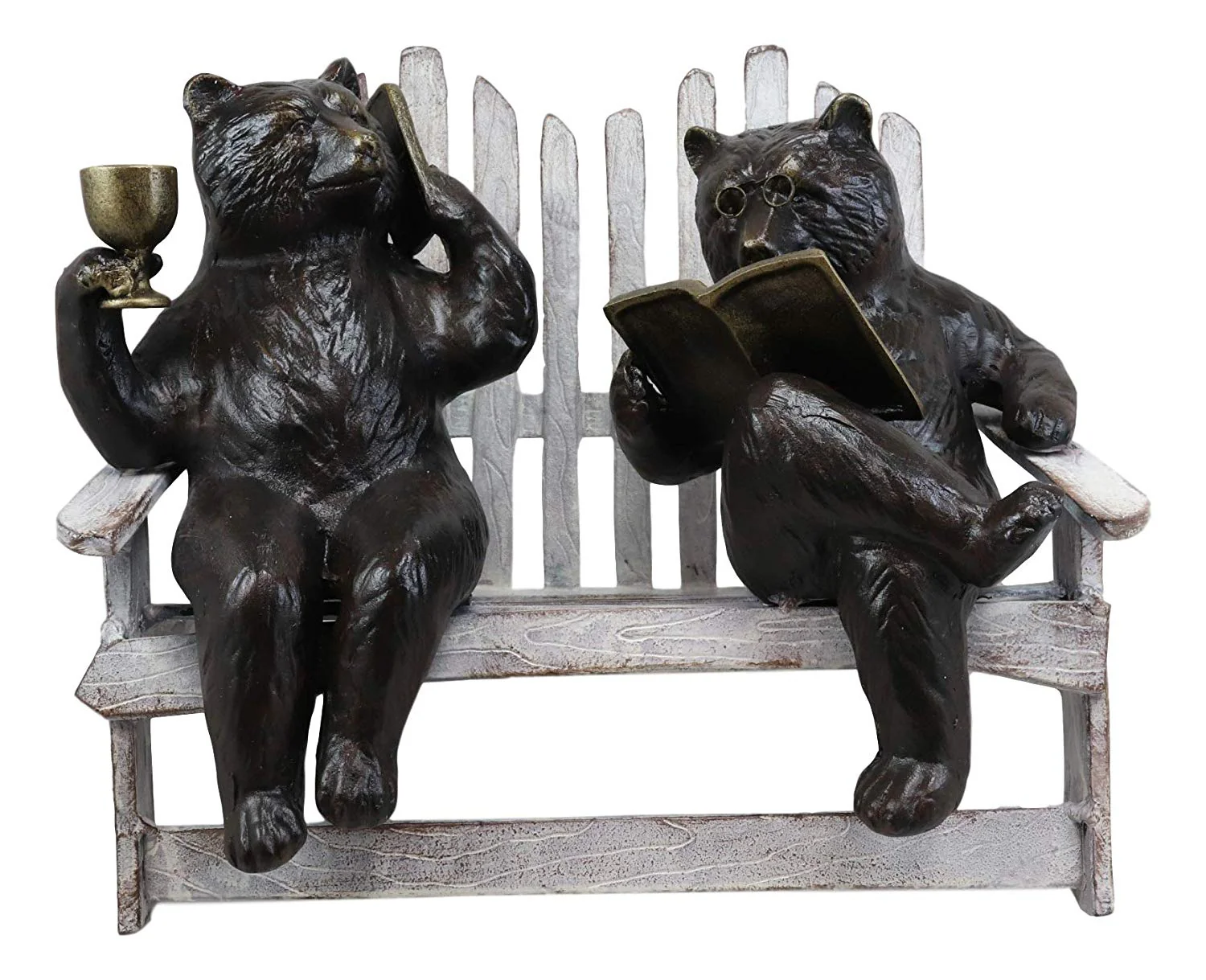• This snapshot picture of this sculpture speaks of how a bear couple spends their leisure time. Not too different from us humans, the wife bear is gossiping on her cell phone while sipping wine while the husband gets this 'me' quiet time reading a book with his glasses on. This gorgeous whimsical solid sculpture will elevate your decore wherever you display it; whether it be your garden, poolside, patio, lawn, pond or what have you!