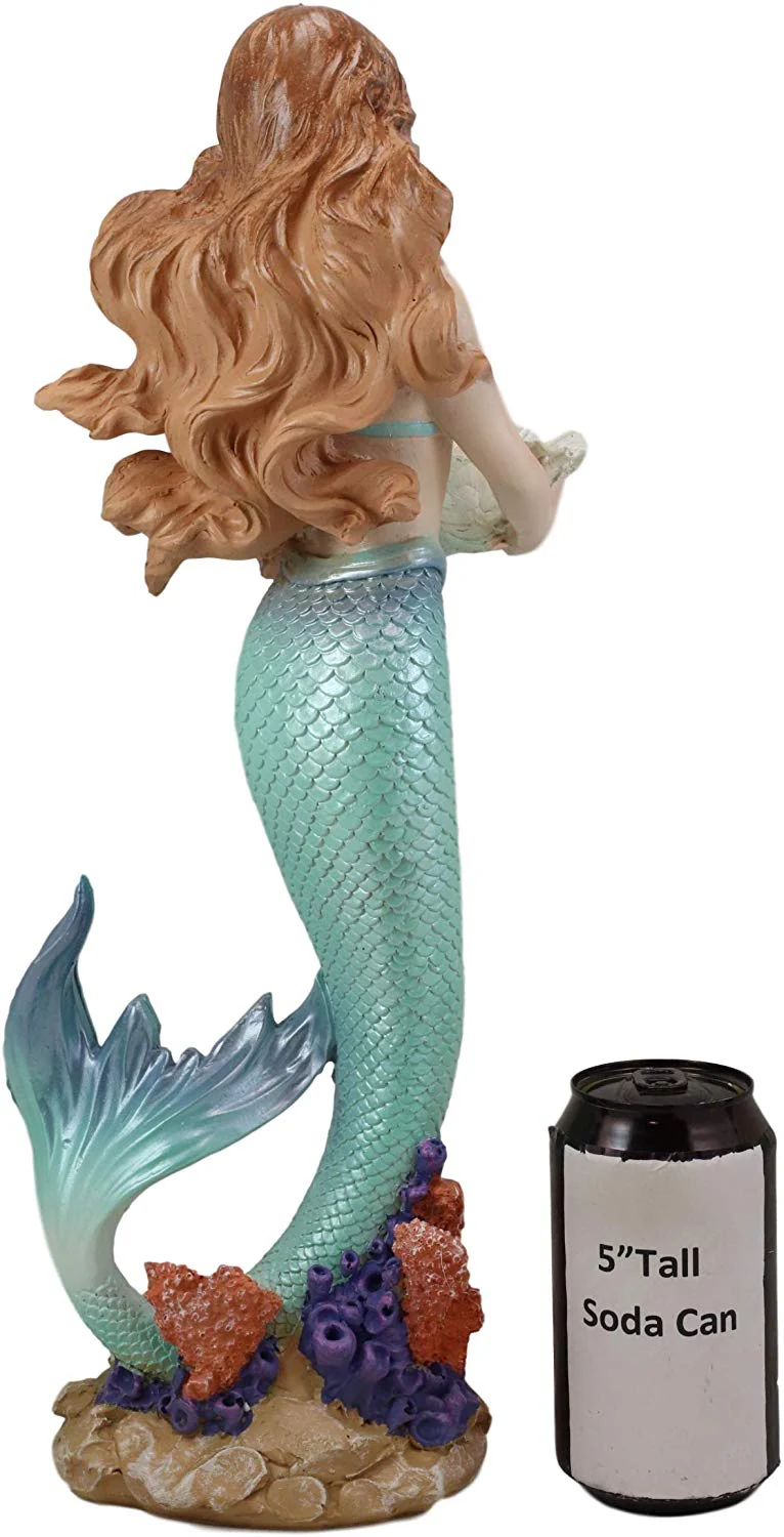 • This fantastic figurine features a sultry siren holding a small shell bowl! You can put a few small bits or bobs or a votive candle in there, and she'll look after them for you. The mermaid has capiz blue-green scales with an iridescent shimmer, and auburn hair. She rests amongst the colorful corals. Unique and magical!