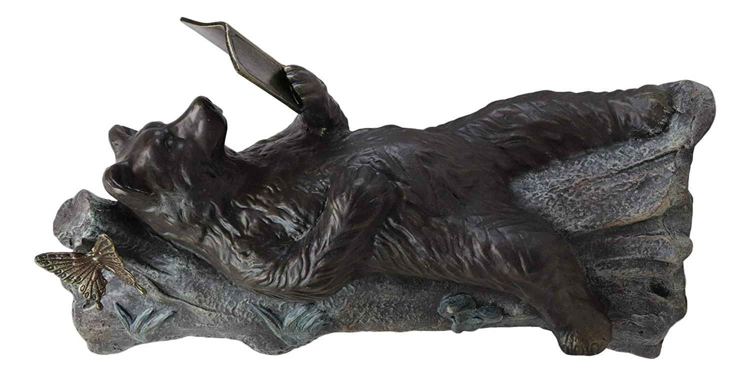 • It is a hot summer day and this grizzly bear has found the best way to pass time. He has got his favorite 'couch' in the form of a tree trunk lying on the forest floor, his favorite story book and his butterfly buddy. This gorgeous solid sculpture will elevate your decore wherever you display it; whether it be your garden, poolside, patio, lawn, pond or what have you!