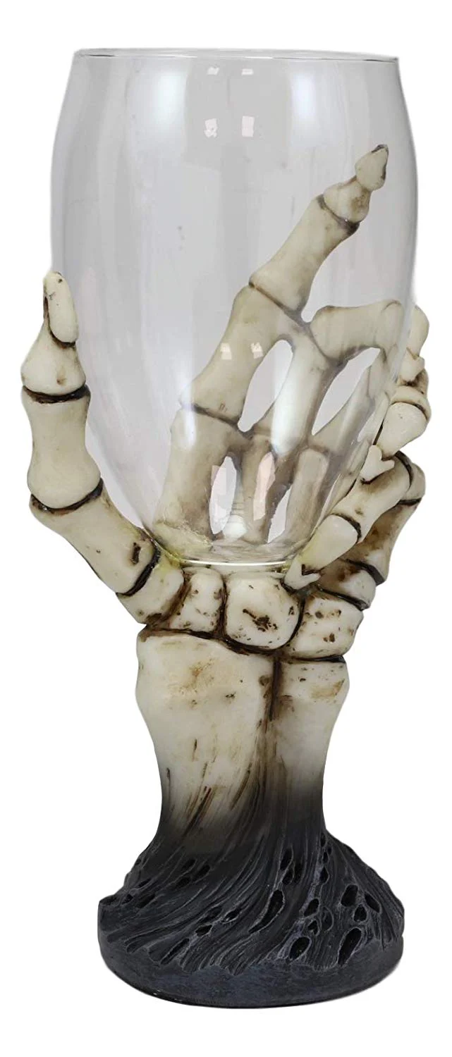 • Drink up to the macabre potion, the drink of eternal fire and death. A bone skeleton hand grasps a delicate glass that will take any beverage you have. It is a wonderful ossuary Halloween party prop and serverware all in one!