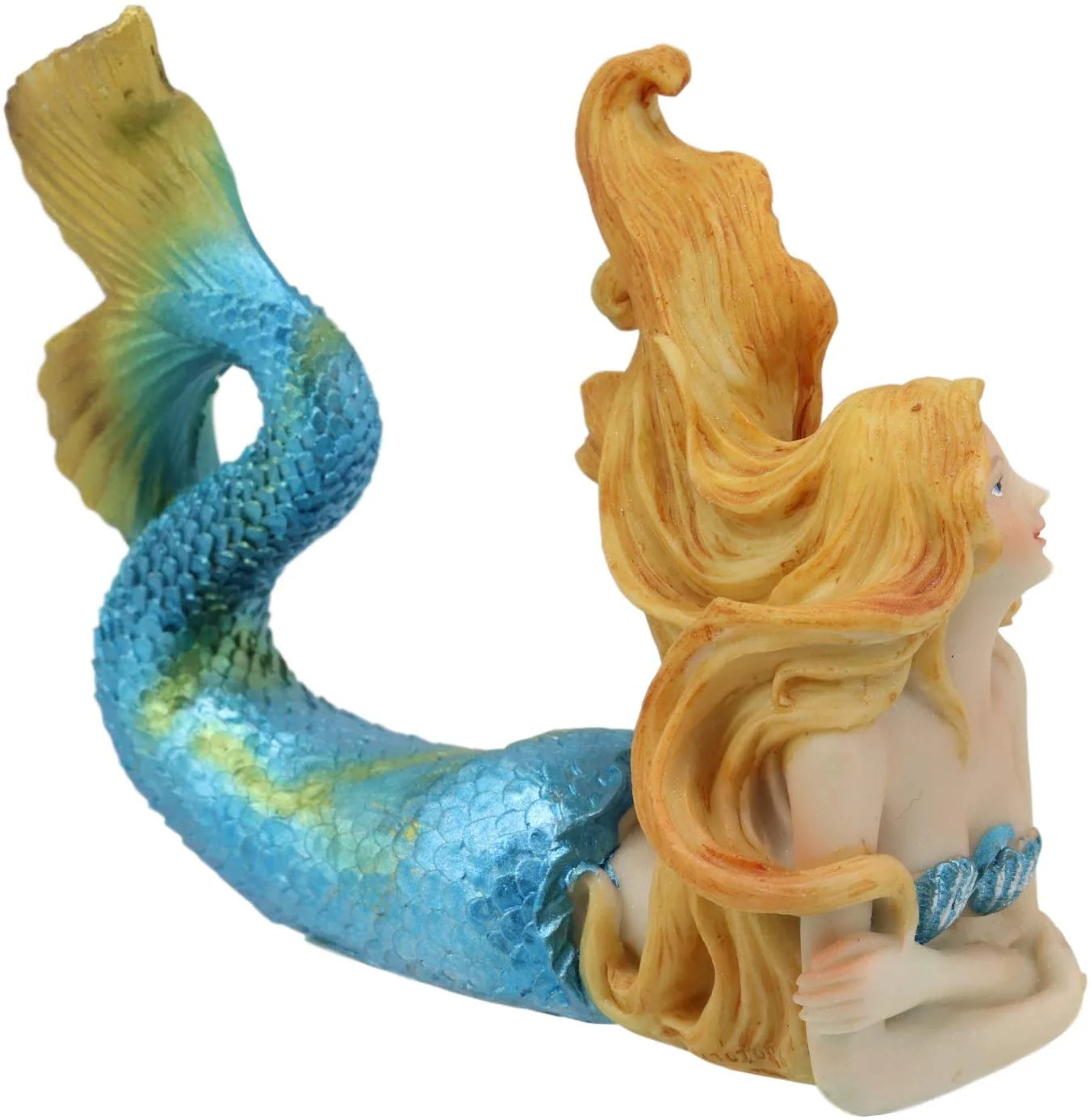 • This lovely mermaid mergirl lies prone on the sea floor while daydreaming of life out of the waters. Her beautiful golden hair flows radiantly with the ocean waves, while her tail shimmers with blue, yellow and orange hues. This pretty mermaid will make a wonderful nautical decor accent for your desktops, tables, countertops, shelves or what have you!