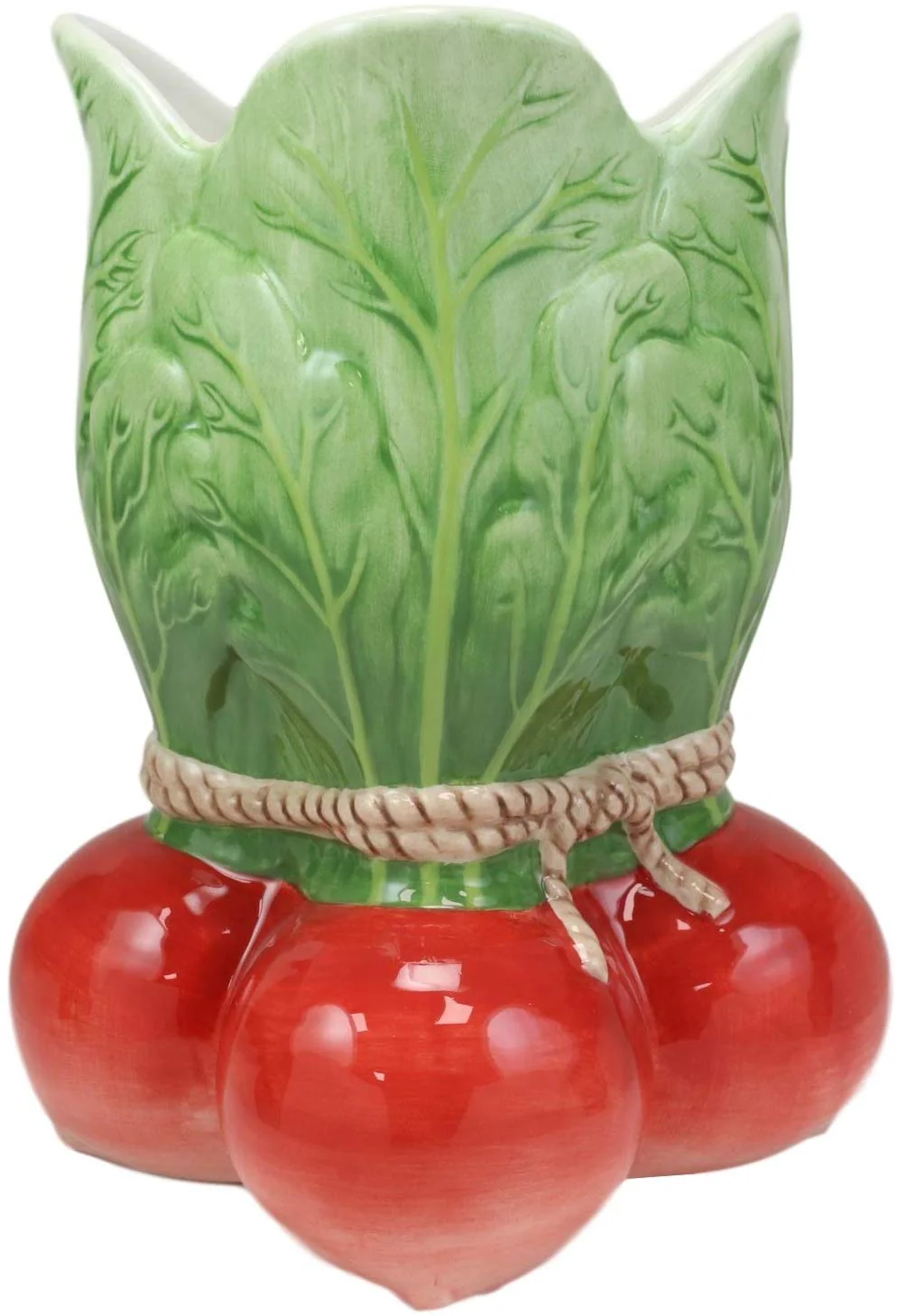 • Brighten up your kitchen decore with this realistic, radish vegetable roots arranged in a bunch earthenware accent. This natural colorful radish inspired vase is designed to hold your flowers or works well as a kitchen utensils holder for your countertop.