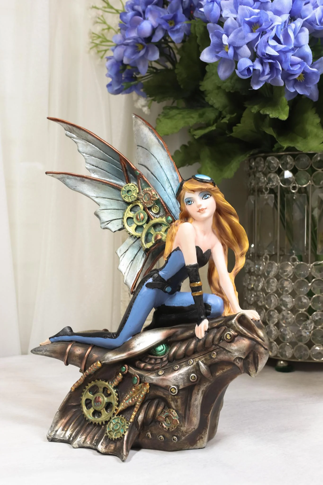 • This beautiful steampunk fairy riding dragon figurine is made of designer composite resin, hand painted and polished individually.