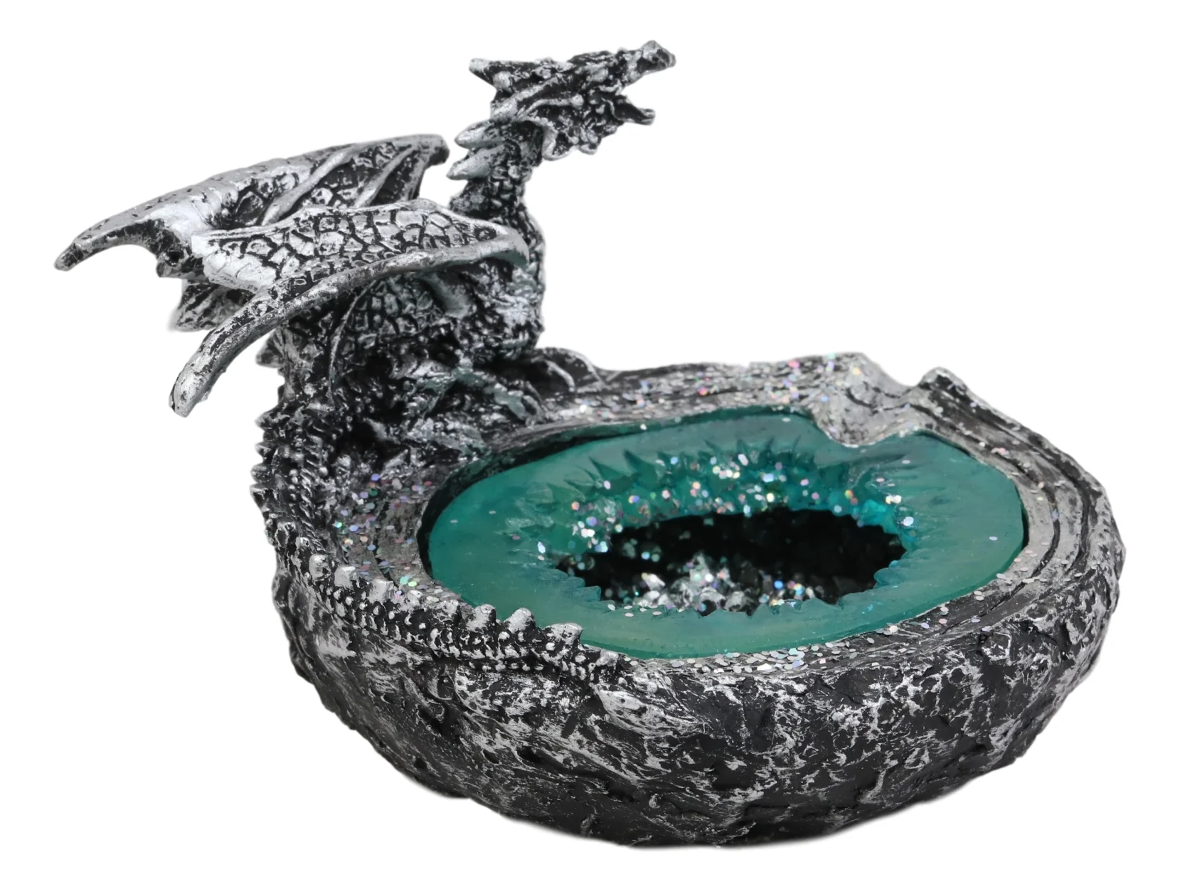 - This dragon is at rest but its guard is not down. You can hear occasional growls and hisses as it coils its body around the crystal quarry. It will only allow ashes from cigarettes/cigars to enter its quarry to recharge itself for its next fireball. The ashtray features a semi metallic grey dragon by a pool of turquoise waters, hiding a cove of endless sparkling crystals and quartz.
