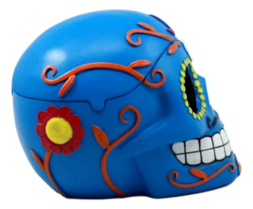 * This Blue Sugar Skull Ashtray has a cool feature that has a lid cap to prevent the cigarette ash from blowing all over your furniture when you are not using the ashtray. You can also use this skull as a jewelry box, key holder or what have you. Celebrate the day of the dead spirit with this Sugar Skull ashtray.