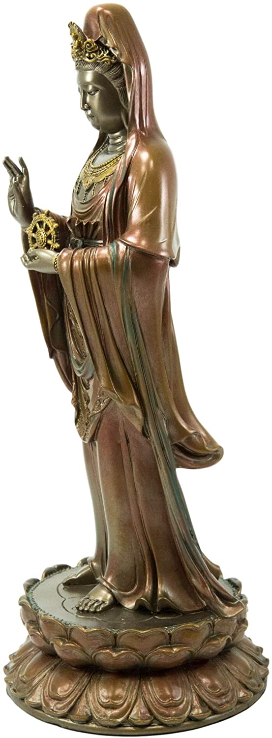 • This Benevolent Goddess Foshan Nanhai Kuan Yin Statue is made of designer composite resin, hand painted and polished individually in faux bronze finish.