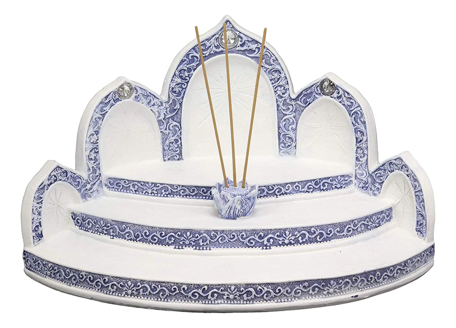 • This Terracotta Blue And White Tibetan Buddhism Altar Shrine Display with Lotus Padma Incense Holder is perfect for displaying our Buddha Miniatures sold separately in our store (3" size category). Painted in terracotta Ming Style blue and white, the altar display stand is adorned with crystals and lace designs throughout the borders. Light your incense sticks on the padma lotus holder in the center of the display stand as you use this display stand as a Feng Shui or Zen accent decor.