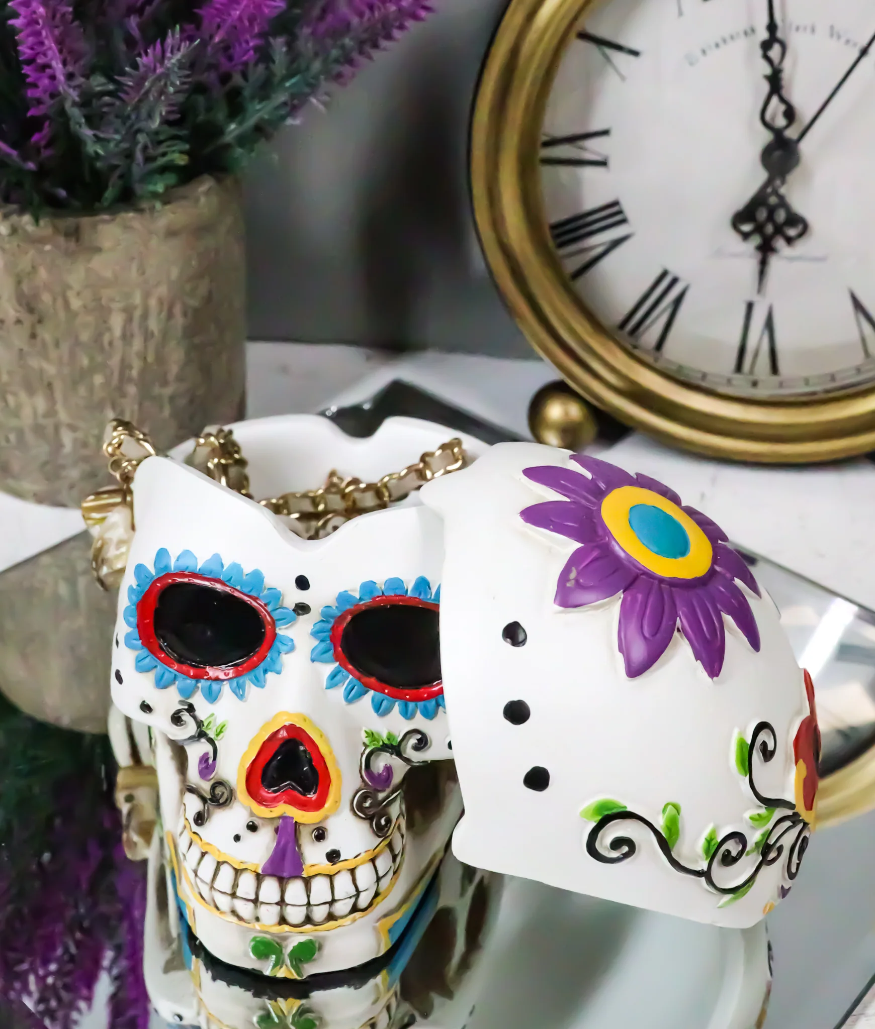 • This sugar skull ashtray has a cool feature that has a lid cap to prevent the cigarette ash from blowing all over your furniture when you are not using the ashtray. You can also use this skull as a jewelry box, key holder or what have you. Celebrate the day of the dead spirit with this Sugar Rose Skull ashtray.