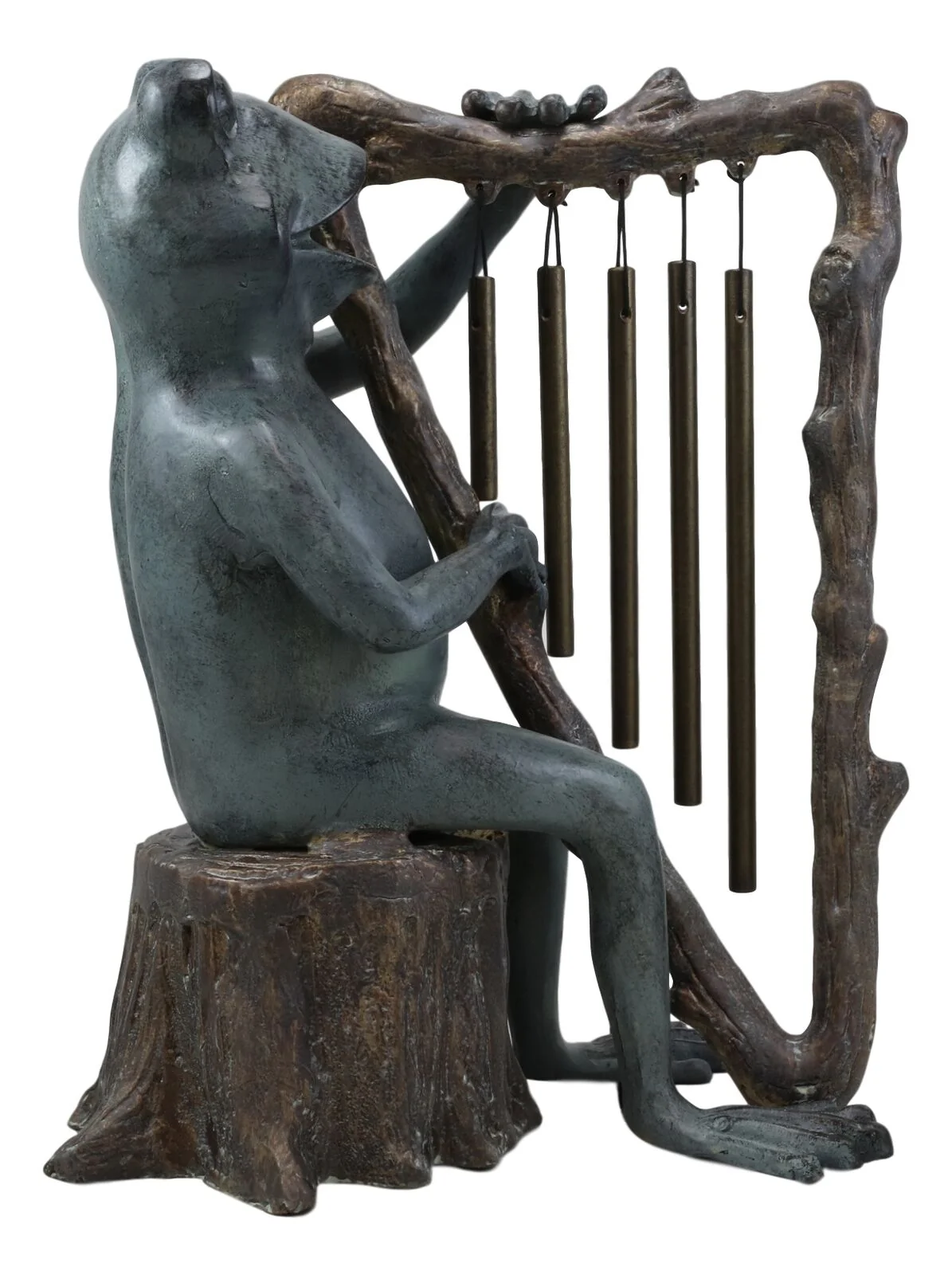 • This Green Frog On Heavenly Harp Tube Wind Chime Garden Statue is made of designer aluminum metal, hand painted and polished in verdi green and bronze finish. Color Tone may vary slightly from pictures. Decorate your patio and garden with our exclusive wind chimes. Our wind chimes are not only artistically beautiful as a decor but they also provide calm and relaxation as the rods chime when the breeze comes through.