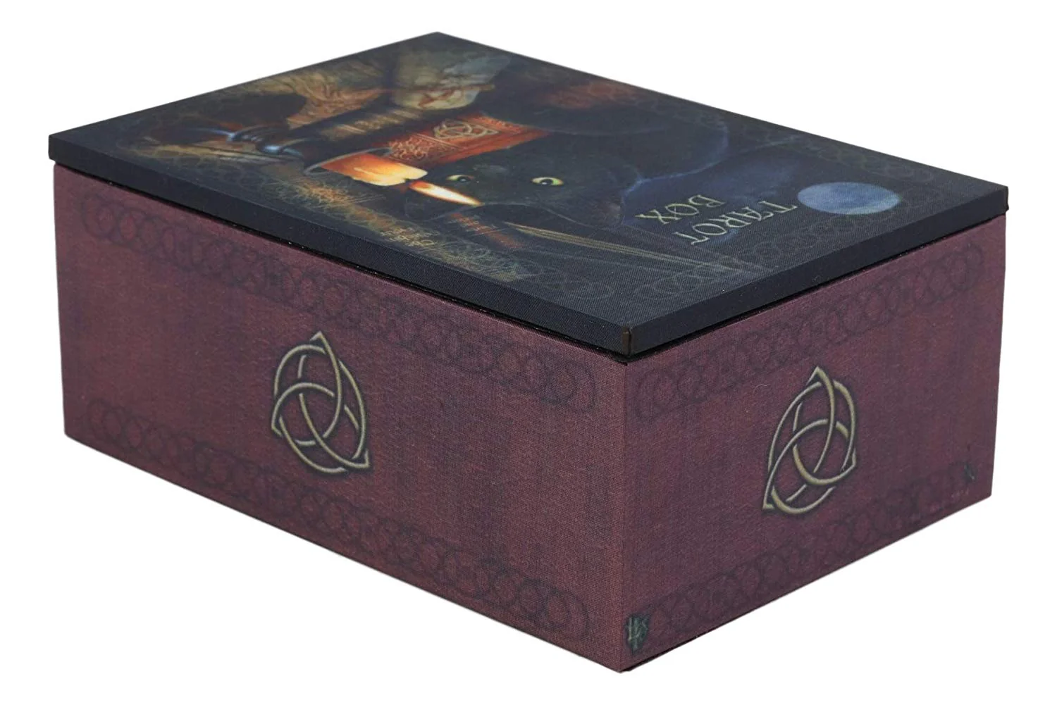 • This box is the perfect place to store your tarot cards and keep their energies pure! The box features a black cat lounging upon it. The feline stares into the flame of a candle as it rests upon arcane tomes, and a full moon rises in the background.